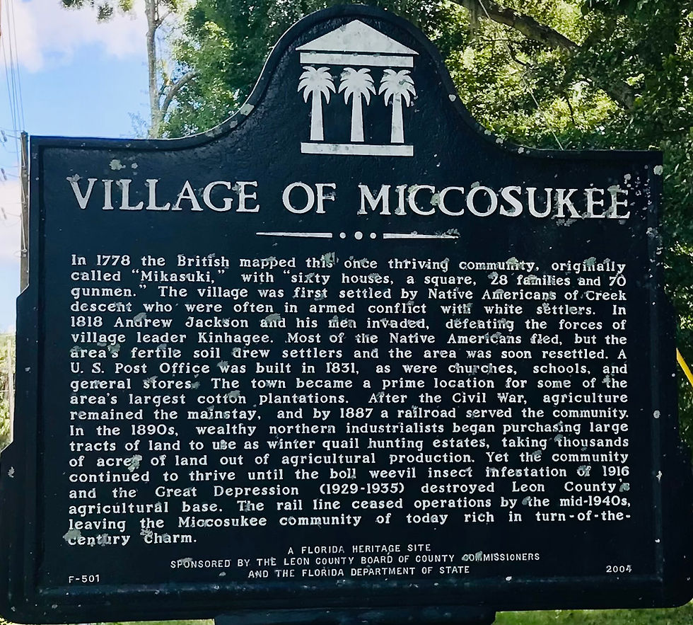 In 1778 the British mapped this once thriving community, originally called “Mikasuki”, with “sixty houses, a square, 28 families and 70 gunmen”. The village was first settled by Native Americans of Creek descent who were often in armed conflict with white settlers. In 1818 Andrew Jackson and his men invaded, defeating the forces of village leader Kinhagee. Most of the Native Americans fled, but the area’s fertile soil drew settlers and the area was soon resettled. A U.S. Post Office was built in 1831, as were churches, schools, and general stores. The town became a prime location for some of the area’s largest cotton plantations. After the Civil War, agriculture remained the mainstay, and by 1887 a railroad served the community. In the 1890s, wealthy northern industrialists began purchasing large tracts of land to use as winter quail hunting estates, taking thousands of acres of land out of agricultural production. Yet the community continued to thrive until the boll weevil insect infestation of 1916 and the Great Depression (1929-1935) destroyed Leon County’s agricultural base. The rail line ceased operations by the mid-1940s, leaving the Miccosukee community of today rich in turn-of-the-century charm.